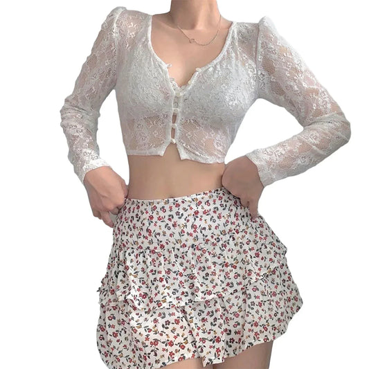 Designer Langarm Bluse mit V-Ausschnitt, Spitze und Transparenz von Fudus