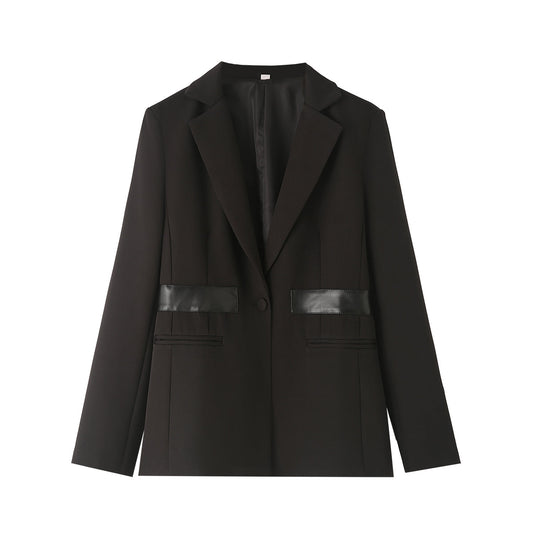 Eleganter schwarzer Blazer mit Leder-Patchwork und einem Knopf