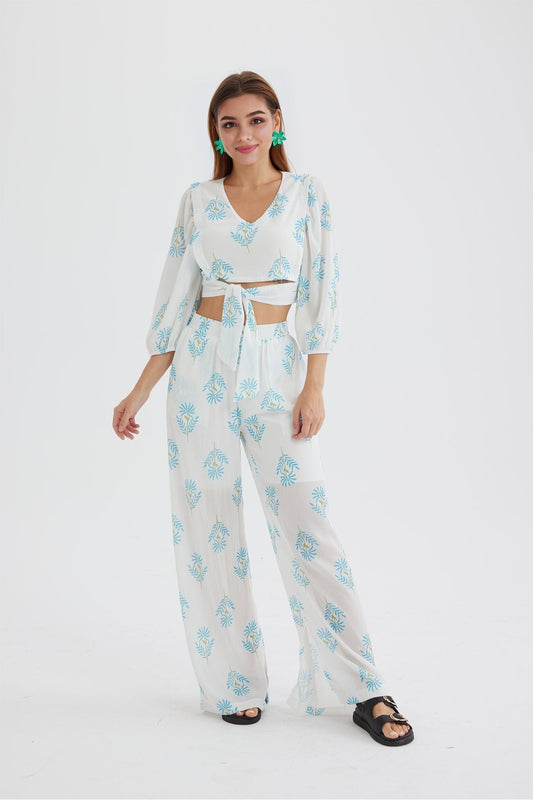 Fudus bedruckte Puffärmel-Oberteil mit Knoten vorne und langer Hose