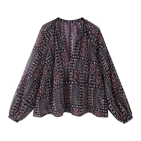 Fudus Chiffon Bluse mit Blumenmuster, V-Ausschnitt und Ballonärmeln, halbtransparent