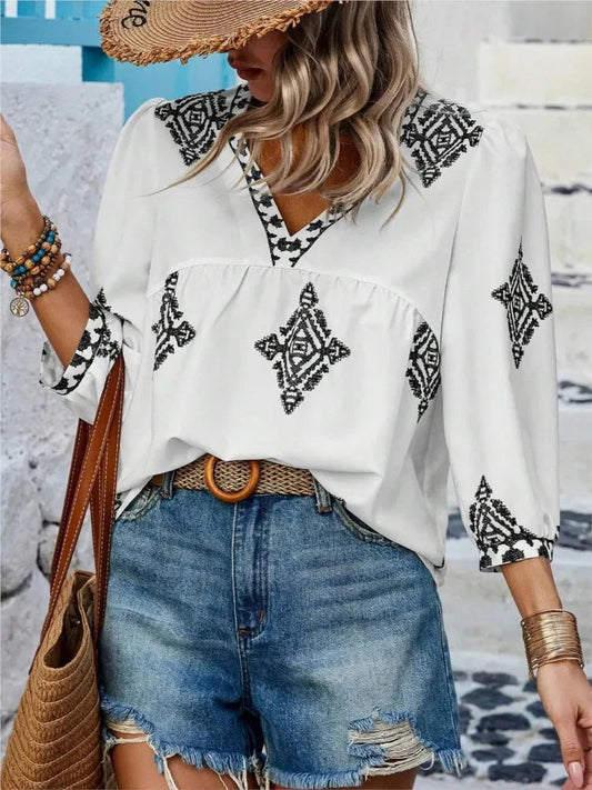 Fudus Damenbluse: Boho-Chic, V-Ausschnitt, bestickt