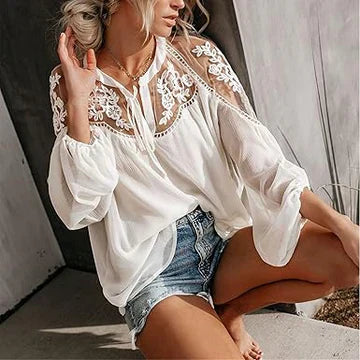Fudus Spitzentop mit botanischem Muster und V-Ausschnitt