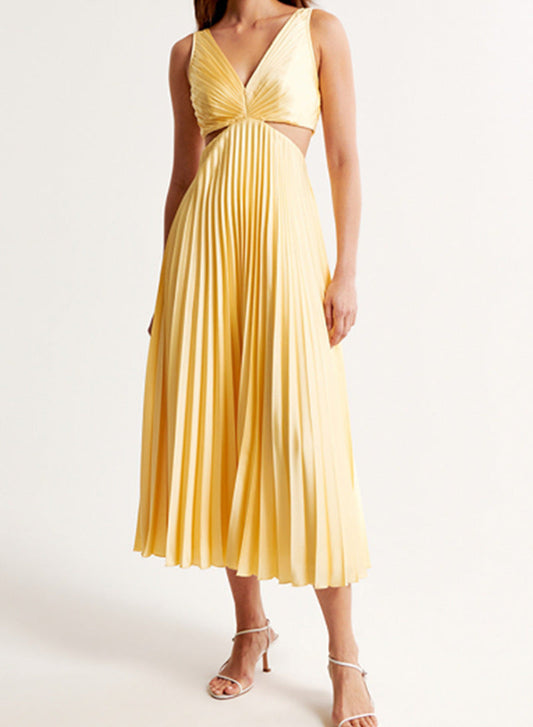Sarah: V-Ausschnitt, ärmelloses, plissiertes Maxikleid mit offenem Rücken