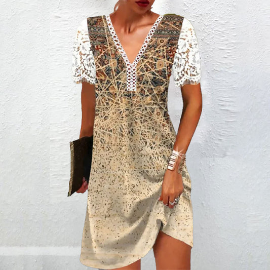 Raffiniertes bedrucktes Spitzenkleid mit V-Ausschnitt und Ärmeln von Fudus