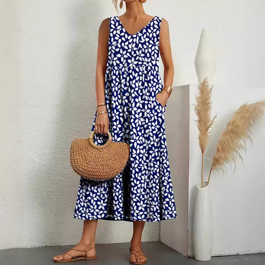 Fudus Sommerkleid: Elegantes, ärmelloses V-Ausschnitt-Printkleid mit Taschen