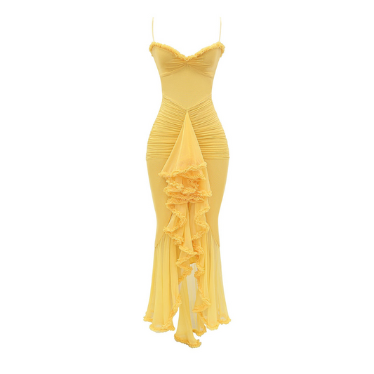 Gelbes, gerafftes Damen-Midikleid für den Sommer (Beth)