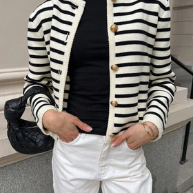 Stay stylish even in cooler temperatures with this chic, long-sleeved striped cardigan. Perfect for any casual outfit. The all-over stripe effect creates a timeless yet modern look. It's soft, comfortable, and provides warmth and style all season long.