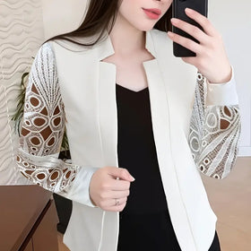Zeitloser, einfarbiger Blazer mit kontrastierender Spitze – vielseitig einsetzbar. Feine Spitzenakzente und offene Front. – Raffinierte Spitzenakzente. – Langärmlig, schlichtes Grundmuster, eleganter Look. – Hochwertige, bequeme und langlebige Materialien. – Für diverse Anlässe geeignet (Arbeit, Events). – Zeitloser Stil und Eleganz.