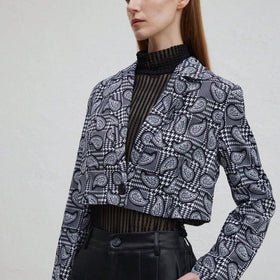 Details: Knopf, Knopfleiste vorne - Revers-Ausschnitt - Einzelknopf-Knopfleiste - Normaler Ärmel - Lässiger Stil - Normaler Typ - Normaler Saum - Schwarz - Allover-Druck - Langarm - Crop Länge - Keine Taschen - Gefütterter Körper - Normale Passform - Nicht dehnbarer Stoff - 100% Polyester - Maschinenwäsche, nicht chemisch reinigen - Nicht transparent.