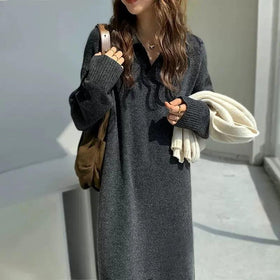 Werten Sie Ihre Wintergarderobe mit unserem lässigen, dicken, warmen Pulloverkleid für Frauen auf. Dieses vielseitige Strickkleid mit Revers bietet volle Ärmel und ein solides Design, perfekt für Herbst und Winter. Bleiben Sie gemütlich und stilvoll mit diesem Must-have.