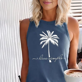 Dieses attraktive, ärmellose Comfy Top in Navyblau mit auffälligem Palm-Muster-Schriftzug und Rundhalsausschnitt ist perfekt für warme Sommertage. Es vereint Stil und Funktionalität.