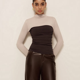 Langärmliges Oberteil mit kontrastierendem Design und figurbetonter Passform. Hoher Rundhalsausschnitt, gerafftes Brustteil. Elastisches, angenehmes Material. Schlichtes, modernes Design.
