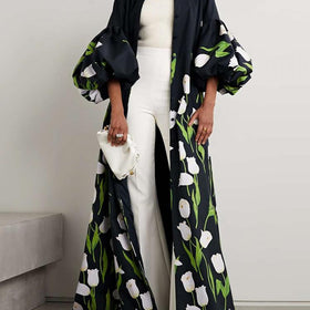 Unser Floral Printed Coat vereint Eleganz und Charme. Dieses Mantelkleid mit wunderschönem Blumendruck ist perfekt für jede Jahreszeit. - Laternenärmel und leichter Stretchanteil im Baumwollmaterial sorgen für Komfort und eine schmeichelhafte Passform. - Die lockere Silhouette und die bodenlange Form verleihen einen edlen Look. Perfekt für Hochzeiten und besondere Anlässe.