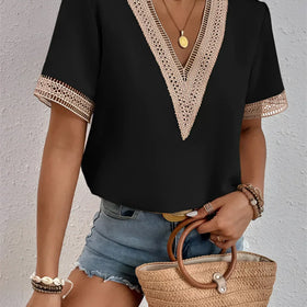 Boho-Sommerbluse für Damen mit schwarzem V-Ausschnitt und Häkelelementen