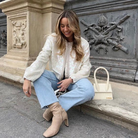 Diese mit Pailletten besetzte Bomberjacke ist ein echter Hingucker! Sie hat lange Ärmel, einen Rundhalsausschnitt, ein Satinfutter und einen Reißverschluss.