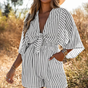 Eleganter und komfortabler Bonafita Sommer-Jumpsuit mit Knoten-Design. Dieser gestreifte Langarm-Romper ist perfekt für Strand und Alltag.