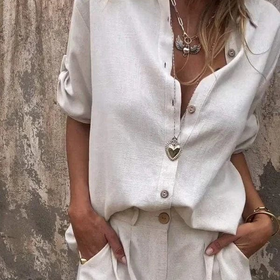 - Material: Leinen - Modell: Oberteil und Shorts - Details: Minimalistisch - Stil: Mühelos schick - Verschluss: Knopf - Saison: Frühling/Sommer - Größe: S - XXL