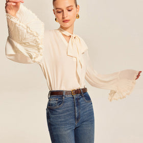 Chiffon Blouse with Semi-Sheer Bow Knot and Pleated Cuffs by Fudus