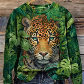 Dieser Jagdprint-Pullover mit Rundhalsausschnitt verbindet exotisches Design mit Komfort. Der lockere Schnitt und das Blatt- und Jaguarmotiv bringen wilde Raffinesse in Ihre Freizeitgarderobe. Ideal für alle, die bequem und auffällig sein möchten.