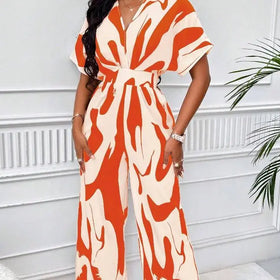 Unser langer Jumpsuit mit V-Ausschnitt und lockerem Druck: Schick und raffiniert mit minimalem Aufwand. Der Jumpsuit besticht durch seinen schmeichelhaften V-Ausschnitt und seine entspannte, lockere Passform. Er ist aus weichem, atmungsaktivem Material gefertigt und mit einem lebhaften Druck versehen.