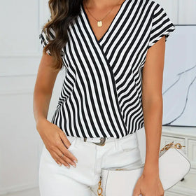 Unsere Sommer-Streifenmuster Surplice Neck Bluse vereint Stil und Komfort. Aus hochwertigen, weichen Materialien gefertigt, strahlt sie Raffinesse aus. Die fesselnde Farbe und das zeitlose Streifenmuster verleihen Ihrem Sommerkleiderschrank einen verspielten Charme. Der Wickelausschnitt sorgt für mühelose Eleganz. Kombinieren Sie sie mit Jeans oder Shorts für ein vielseitiges Outfit.