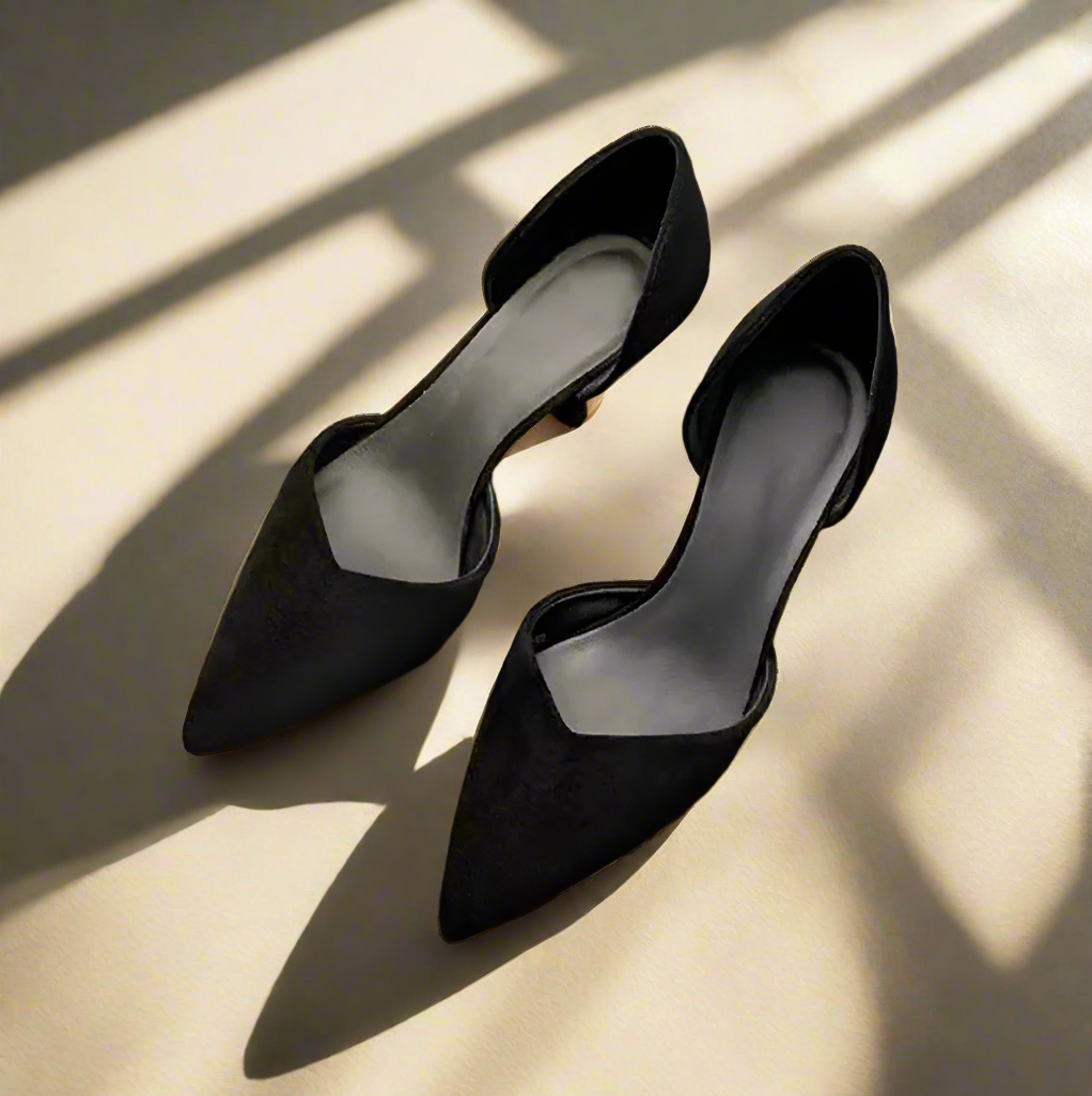 Diese eleganten schwarzen Absätze verkörpern zeitlose Eleganz. Gefertigt aus luxuriösem Mikrofaser-Leder, strahlen sie pure Klasse aus. Der schmale Absatz sorgt für einen bequemen und dennoch raffinierten Stand, während die spitze Schuhspitze einen Hauch von dezentem Luxus verleiht. Die offene Seite sorgt für einen besonders eleganten Look.