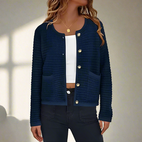 Eine dunkelblaue Cardigan mit goldenen Knöpfen, perfekt für den Old Money Stil. Die dunkelblaue Farbe und goldene Knöpfe verleihen einen Hauch von Luxus.