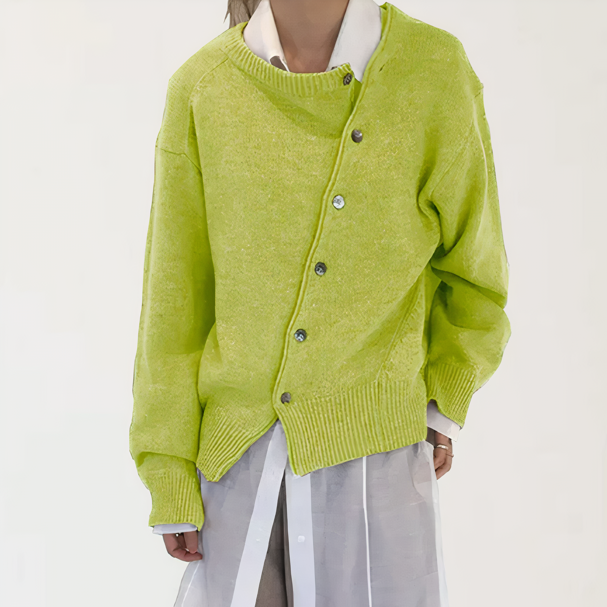 Genießen Sie mühelosen Stil mit dieser asymmetrischen Strickjacke für Damen. Der schräge Knopfverschluss und die lockeren, übergroßen Ärmel verleihen dem weichen, strukturierten Design eine einzigartige Note. Perfekt zum Kombinieren, vereint dieser Strickjacke Komfort und Eleganz für jeden Anlass.