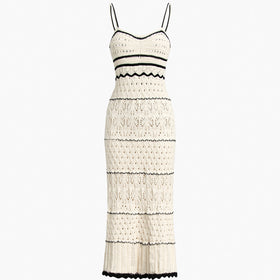 Dieses taillierte Maxi-Häkelkleid in Creme und Schwarz vereint Eleganz und Klasse. Spitzen- und Strickdetails verleihen einen luxuriösen Touch, schwarze Akzente sorgen für Struktur.