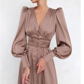 Dieses Kleid vereint einen stilvollen V-Ausschnitt mit trendigen Puffärmeln, perfekt für Damen, die bei festlichen Gelegenheiten strahlen möchten. Mit seinem zeitlosen Design und dem angenehmen Stoff ist das Kleid vielseitig einsetzbar.