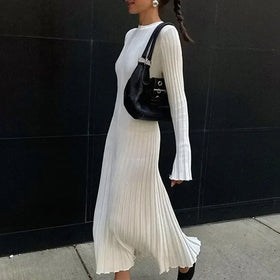 Elegantes, langes Plisseekleid mit Rundhalsausschnitt und Bindegürtel. Fließender Schnitt für optimalen Komfort und Stil. Ideal für Herbstveranstaltungen oder als Streetwear. Erhältlich in verschiedenen Farben. Größen: S - L.