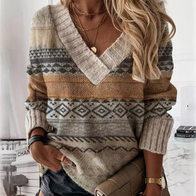 Dieser beige-braune gestreifte Pullover verbindet zeitloses Design mit Komfort. Der V-Ausschnitt und geometrische Muster setzen stilvolle Akzente für entspannte Tage oder lässige Anlässe. Seine weiche Textur und vielseitige Farbkombination machen ihn zum Must-have.