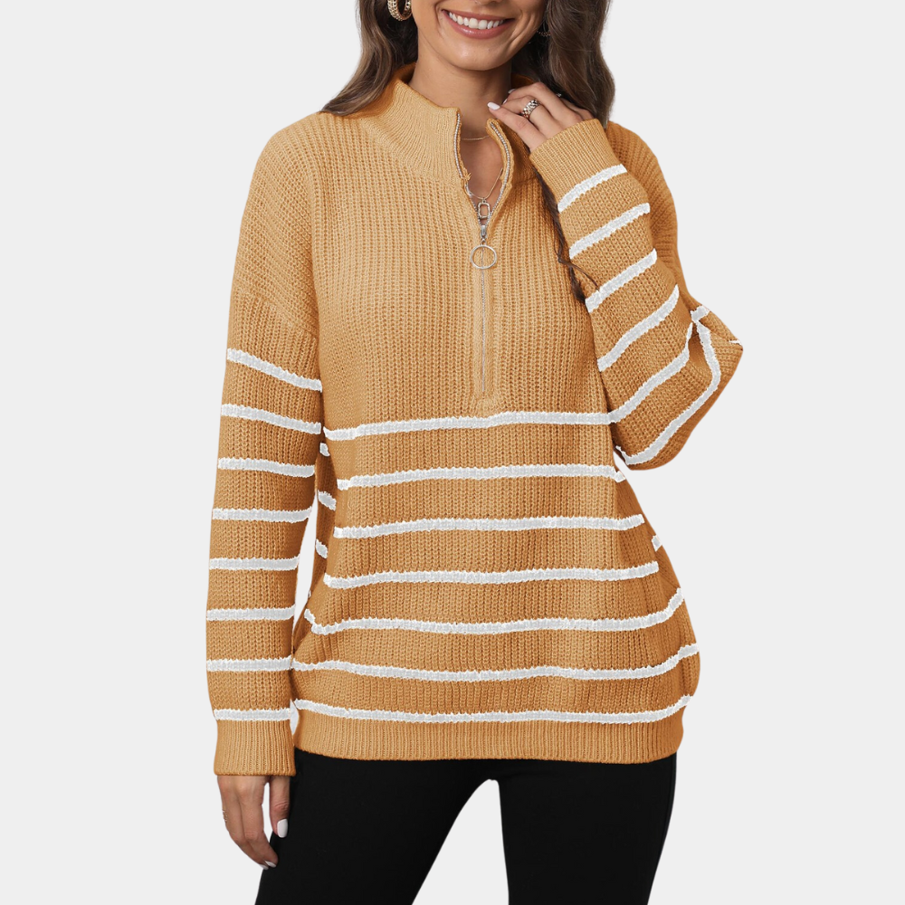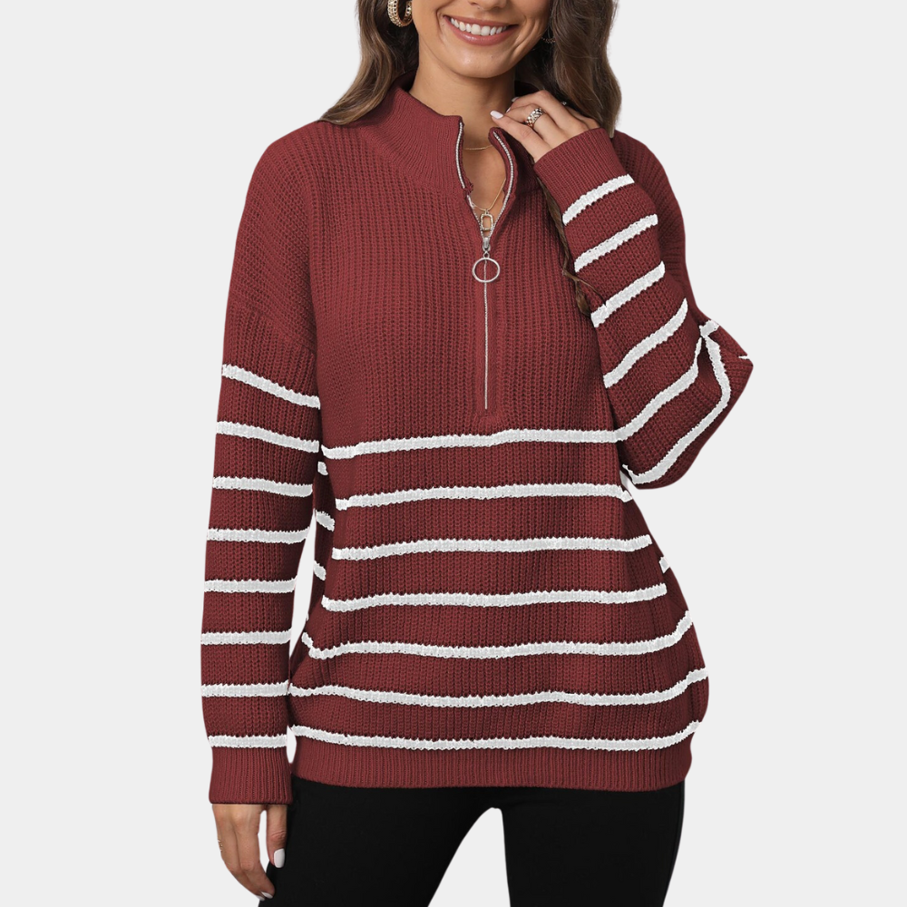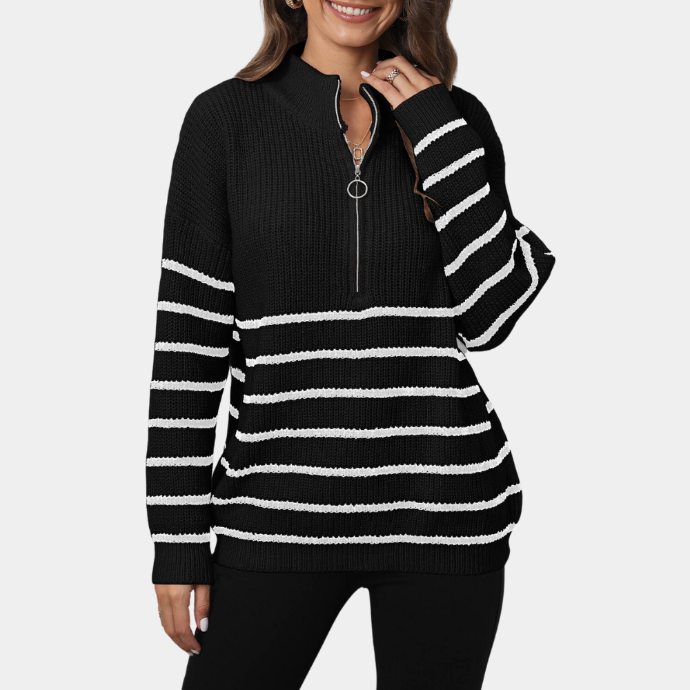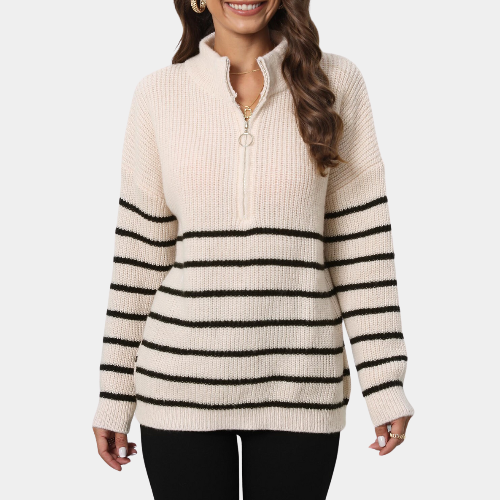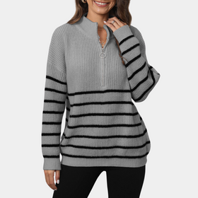 Damen-Pullover Nydia: Lockerer gestreifter Strickpullover mit kurzem Reißverschluss