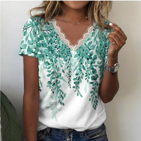 Dieses modische Damen-T-Shirt mit V-Ausschnitt bietet stilvolles Design und höchsten Komfort. Wunderschöner Blumendruck und zarte Spitzenverzierung machen es perfekt für den Sommer. Ideal für verschiedene Anlässe.