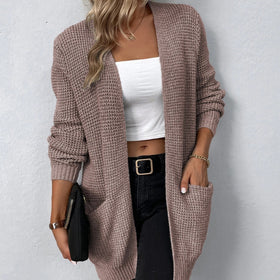 Diese praktische Strickjacke in neutralem Uni-Farbton hat einen langen Schnitt und praktische Taschen.