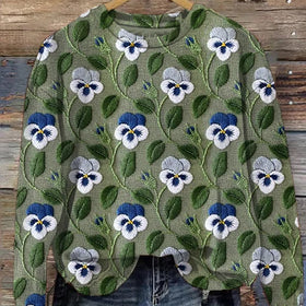 Dieser wunderschön bestickte Pullover zeigt ein atemberaubendes florales Design mit Stiefmütterchen und Blättern in sanften Blautönen, Lavendel und Grün. Die dichte, detaillierte Stickerei bedeckt das gesamte Kleidungsstück und verleiht ihm eine reichhaltige Textur und einen lebendigen, künstlerischen Touch. Mit seinem Rundhalsausschnitt und den langen Ärmeln kombiniert dieser Pullover Komfort und Eleganz für den Alltag.