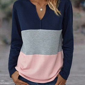 Bringen Sie frischen Stil in Ihre Garderobe mit diesem lebendigen Color-Block-Pullover. Er ist aus strukturiertem Rippstrick gefertigt, hat einen schmeichelhaften V-Ausschnitt und ist bequem und schick zugleich. Die fließenden horizontalen Farbpanels setzen ein Highlight in jedem lässigen Outfit.