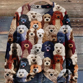 Dieser verspielte, kurze Pullover zeigt ein charmantes, mehrfarbiges Hundemuster. Gedämpfte Erd- und Blautöne sorgen für einen gemütlichen, stylischen Look. Der gestrickte Stoff bietet angenehmen Tragekomfort. Ein perfekter Mix aus Spaß und Komfort für jede lässige Garderobe.