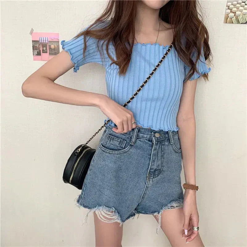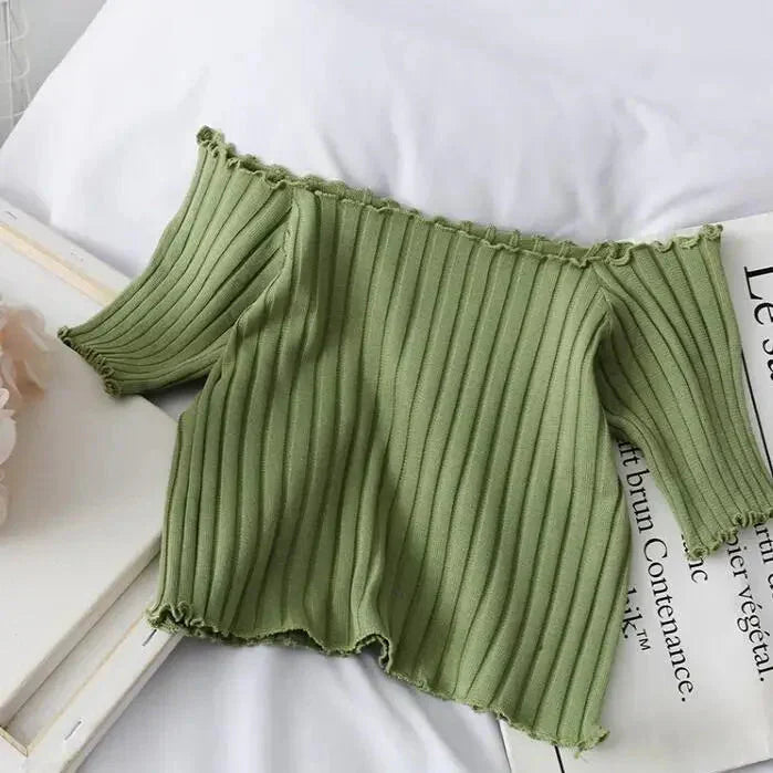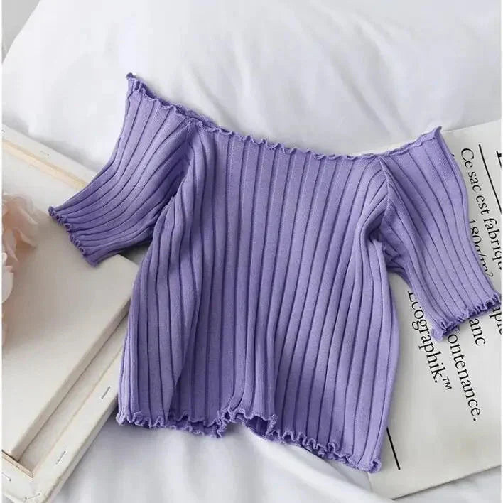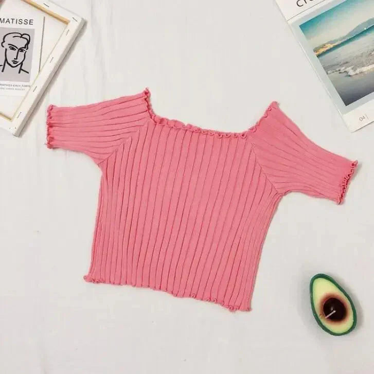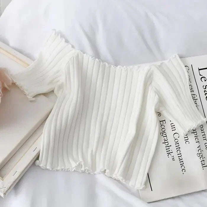 Designer Rippstrick T-Shirts von Fudus, schulterfrei