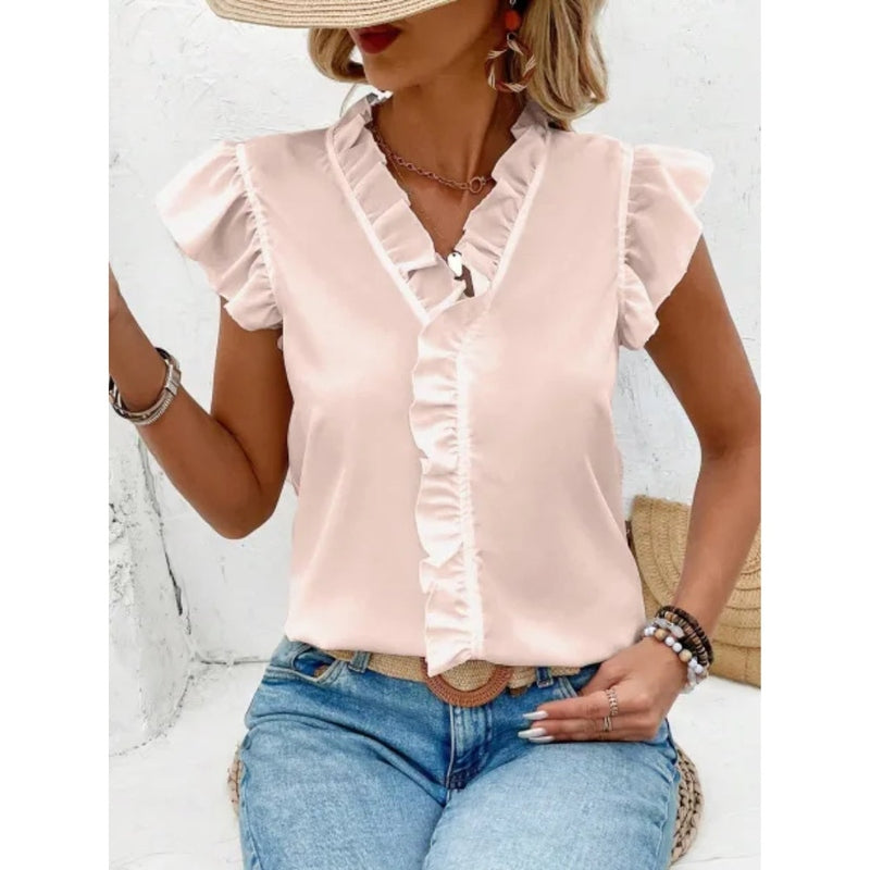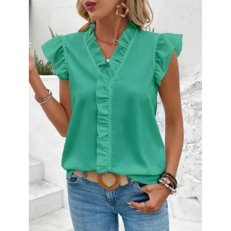 Diese stilvolle Bluse mit romantischen Rüschen und V-Ausschnitt sorgt für einen femininen, eleganten Look. Perfekt für warme Tage und vielseitig kombinierbar, bringt sie frischen Wind in Deinen Kleiderschrank.