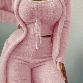Dieser warme und einladende Samtschlafanzug ist niedlich und praktisch. Er besteht aus drei Teilen: kurzem Oberteil, Langarm-Cardigan und Shorts oder Schlafanzughose. Ein echter Kuscheltraum!
