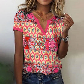 Entdecken Sie dieses exquisite Kurzarm-Top mit mehrfarbigem Muster und V-Ausschnitt – exklusiv von Mia Wagner. Komfort und Design vereint für unvergessliche Tage. Das lockere Design schmeichelt jeder Figur, hochwertige Materialien sorgen für Luxus. Ein Statement-Piece für jeden Anlass.