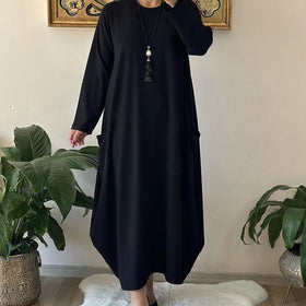 Dieses schlichte Kleid mit Rundhalsausschnitt ist perfekt für legere Anlässe. Die lockere, fließende Silhouette bietet Komfort und einen schicken, minimalistischen Look. Es ist vielseitig kombinierbar und schmeichelt allen Körpertypen.