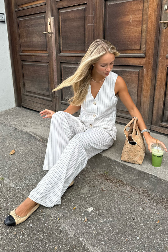 - Accessoires: Trendige Handtasche und Schmuck.
