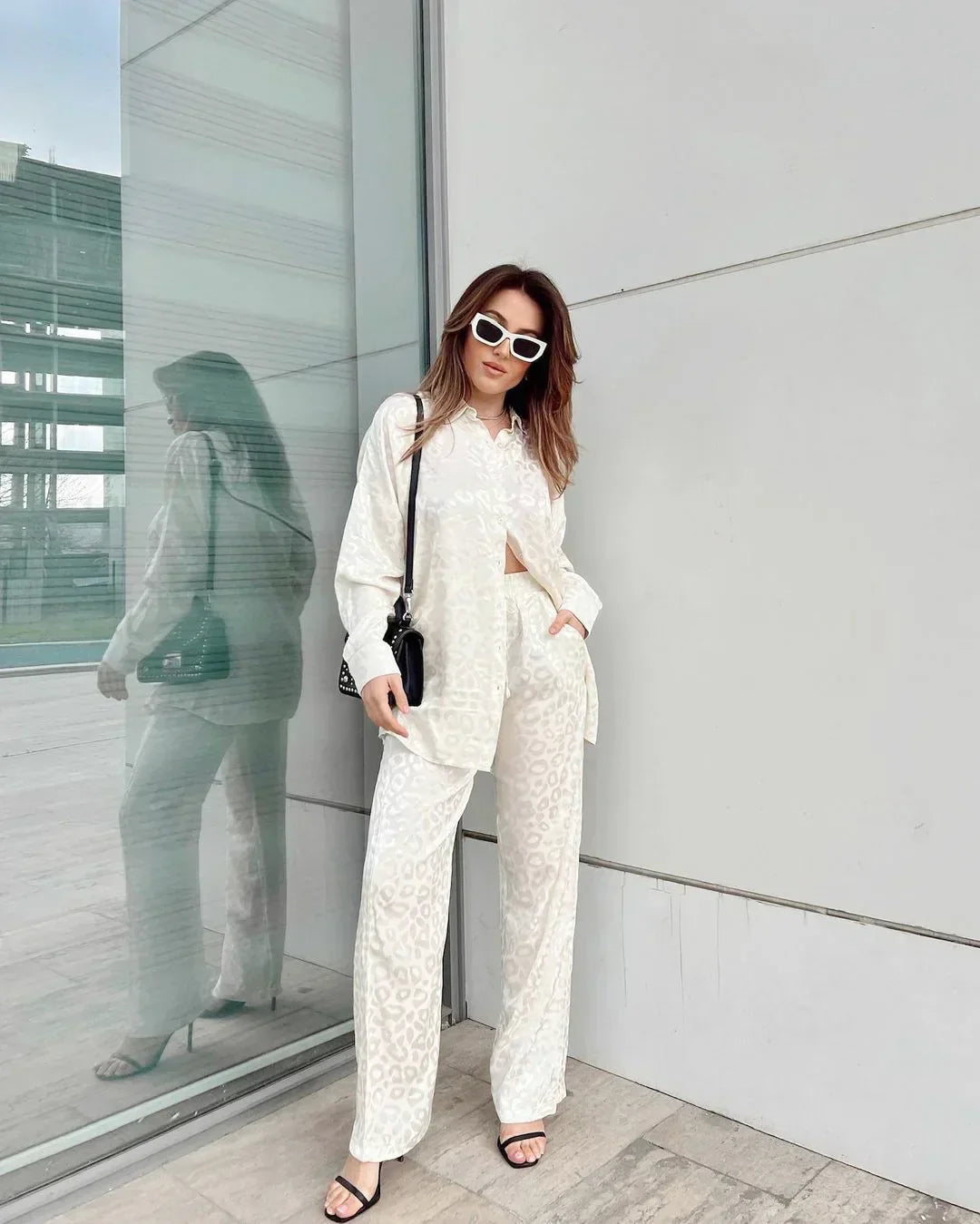 Ein unvergleichliches Erlebnis mit der Stylish Single Breasted Blouse und der Wide Leg Pants: Entdecken Sie unser exklusives Set, ein Meisterwerk an Leichtigkeit und höchster Qualität. Jede Naht, jedes Detail spiegelt die Sorgfalt und Handwerkskunst wider.