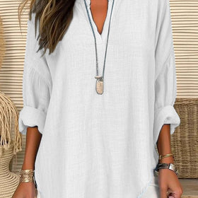 Diese schicke Leinenbluse für den Sommer kombiniert stilvolle Leichtigkeit mit natürlichem Tragekomfort. Der atmungsaktive Leinenstoff sorgt für ein angenehmes Hautgefühl und hält Sie auch an heißen Tagen frisch. Mit ihrem eleganten Schnitt und dem zeitlosen Design passt sie perfekt zu sommerlichen Outfits – ob lässig mit Jeans oder schick mit einer Leinenhose. Ein Must-have für stilbewusste Frauen, die Eleganz und Komfort schätzen.