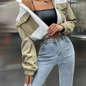 Elegante Teddyjacke mit Farbblock-Patchwork, Reißverschluss und Pattentasche von Shisara