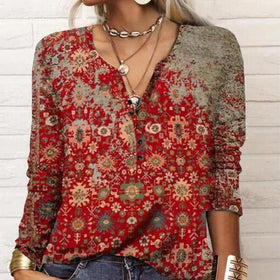 Dieses Damen-Top bringt Eleganz und Kreativität in deine Garderobe. Auffälliges florales Muster und dezente Knopfdetails am V-Ausschnitt verleihen einen charmanten Look. Perfekt für jeden Anlass.