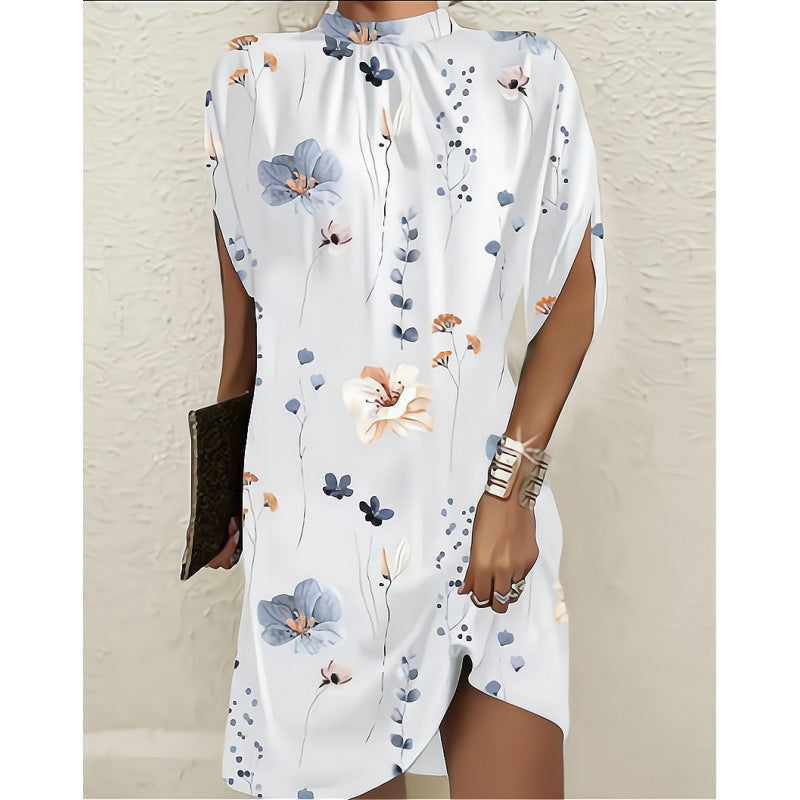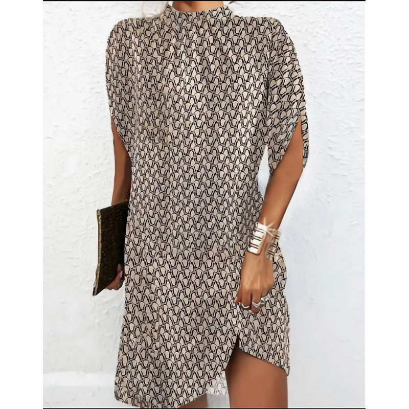 Arbeitsstil Kleid. Material: Acryl. Einteiler. Mittellanger Rock. Rundhalsausschnitt. Buntes Muster. Fledermausärmel. Kurze Ärmel. Pendelstil. Bedruckt.