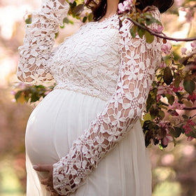 Elegantes Fudus Schwangerschaftskleid mit Ausschnitten, Spitze, Chiffon, Rundhals, langen Ärmeln, für Abend, Abschlussball